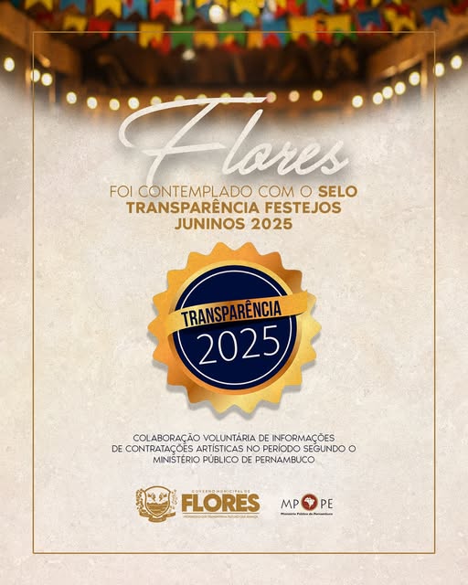O Governo Municipal de Flores tem a alegria de compartilhar com a população mais uma importante conquista: fomos reconhecidos pelo Ministério Público de Pernambuco (MPPE) com o Selo Transparência 2025, por uma atuação clara, responsável e comprometida na divulgação das contratações artísticas durante os festejos juninos. Esse reconhecimento reforça nosso compromisso com a legalidade, a
